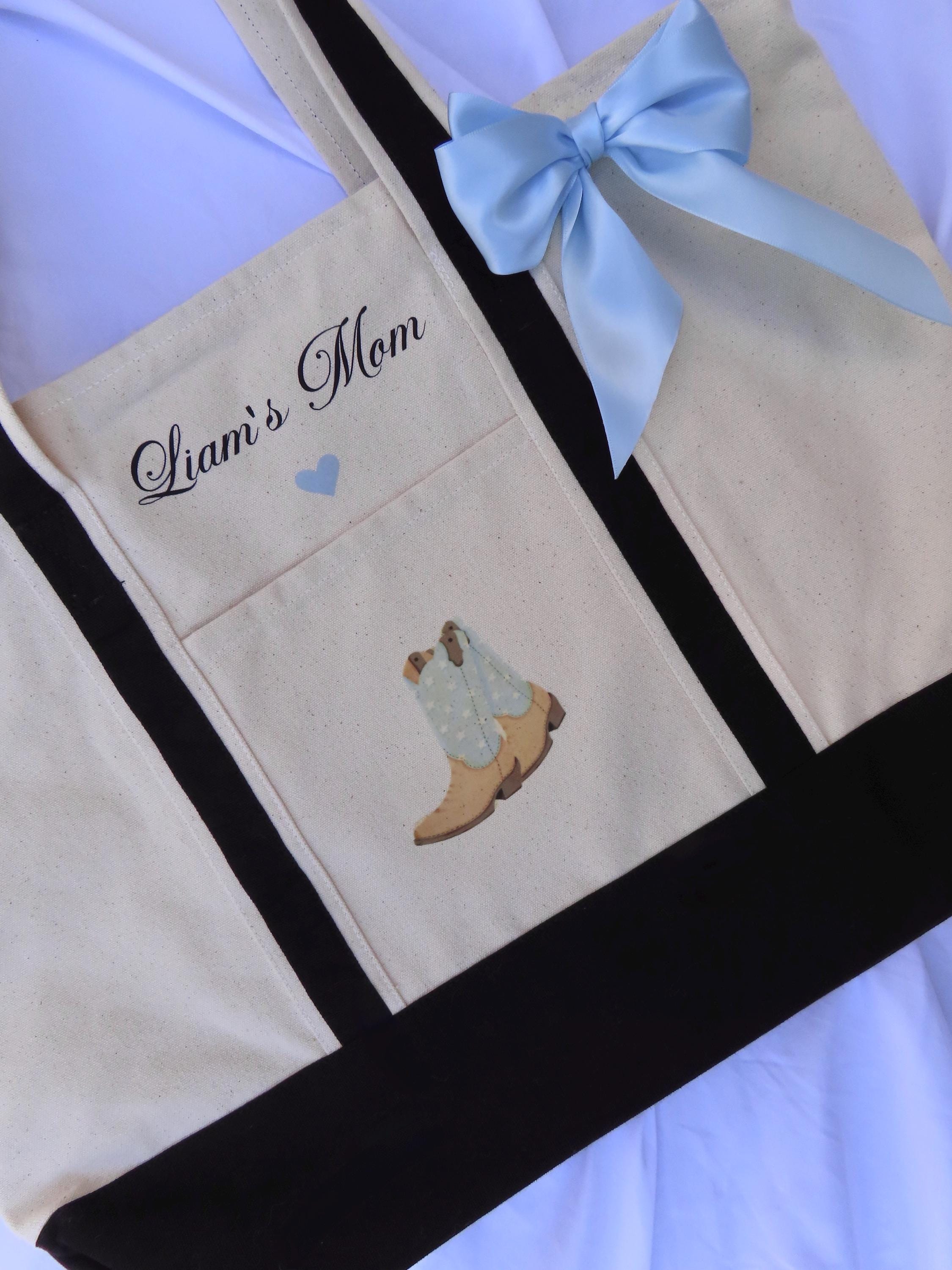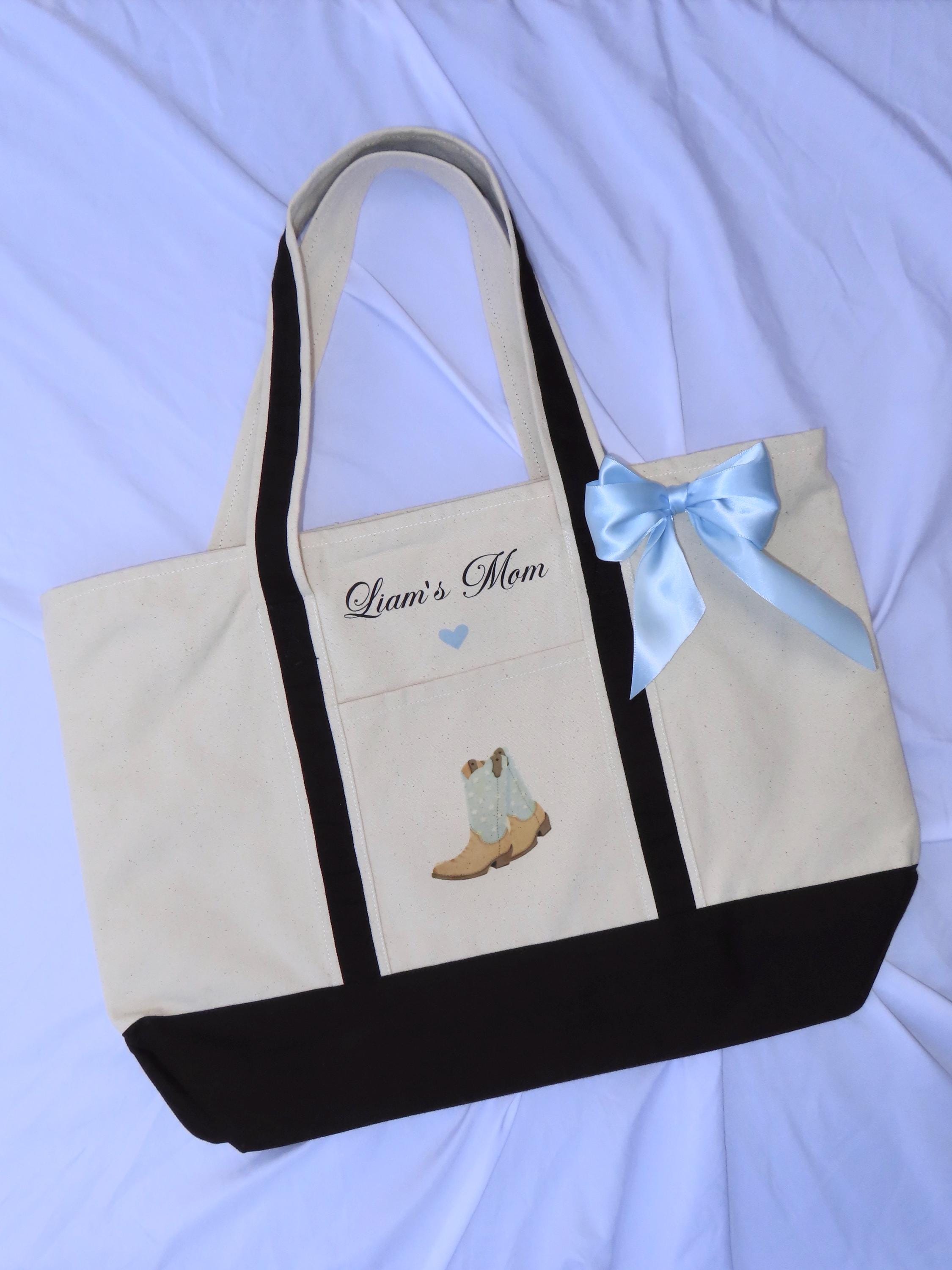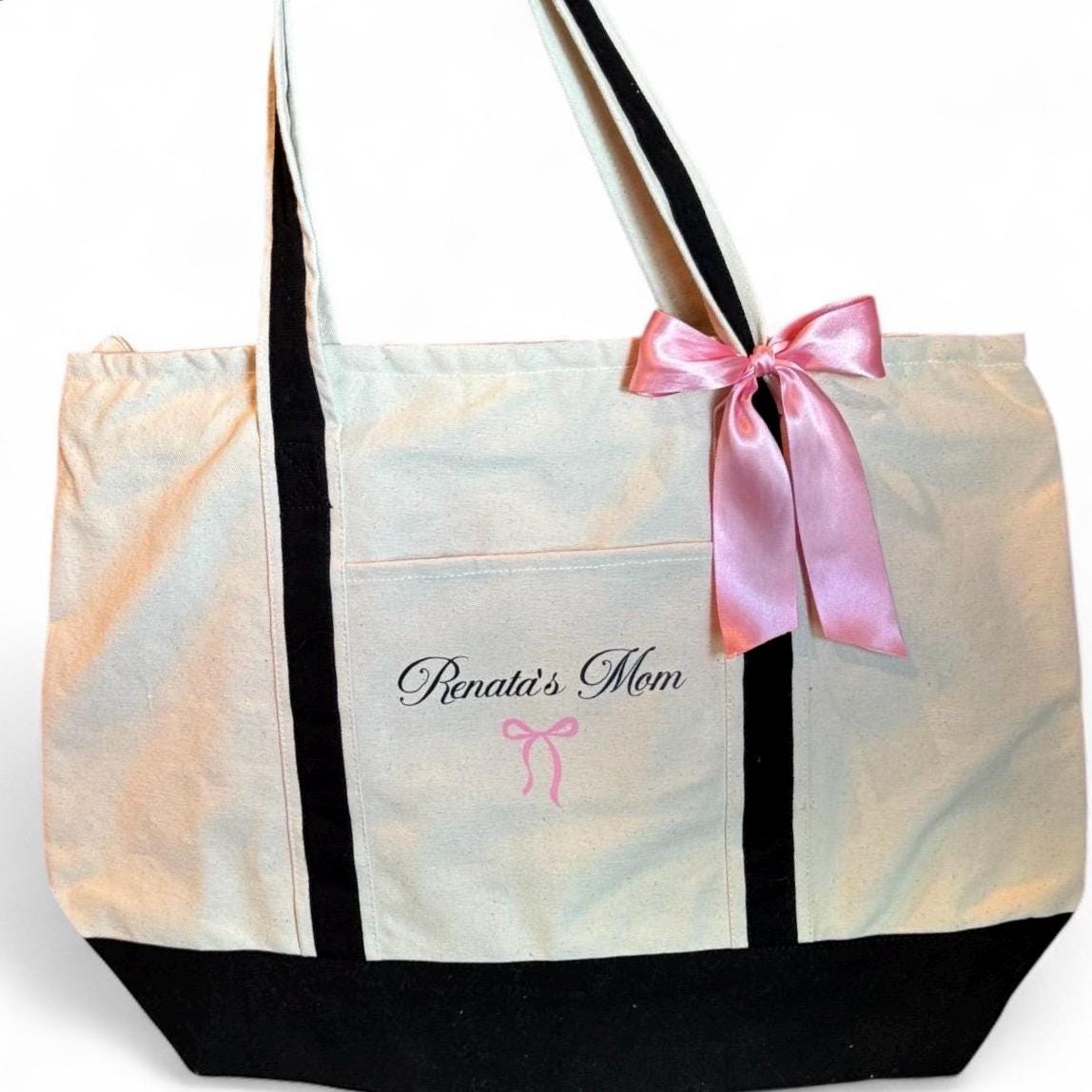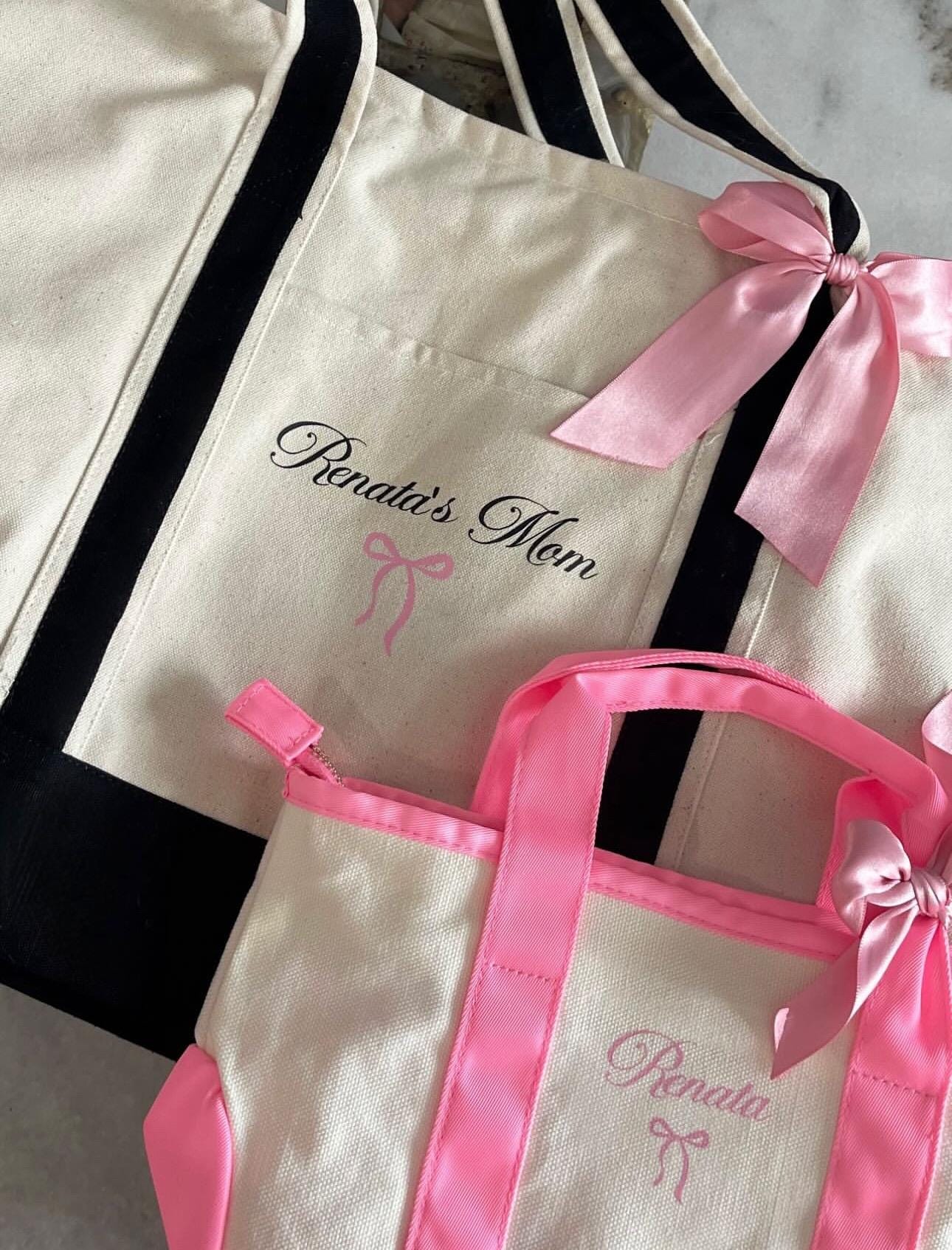 • Mommy + Me Set: Includes 1 large black tote + 1 small pink tote • Large Tote Only: Black canvas with personalization option • Small Tote Only: Pink mini tote (perfect for littles!) • Optional hand-tied satin bow 🎀 (+$2 each)