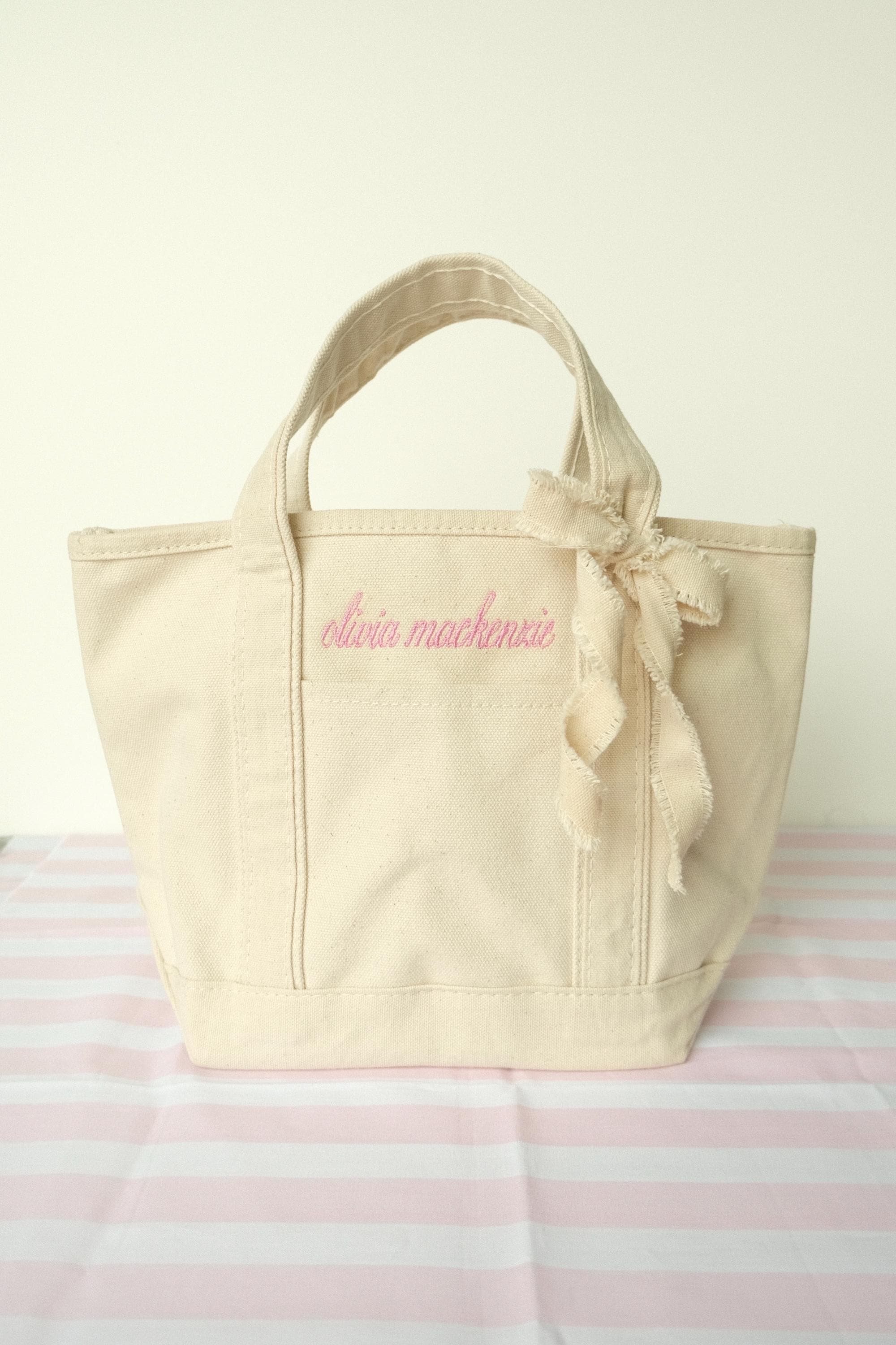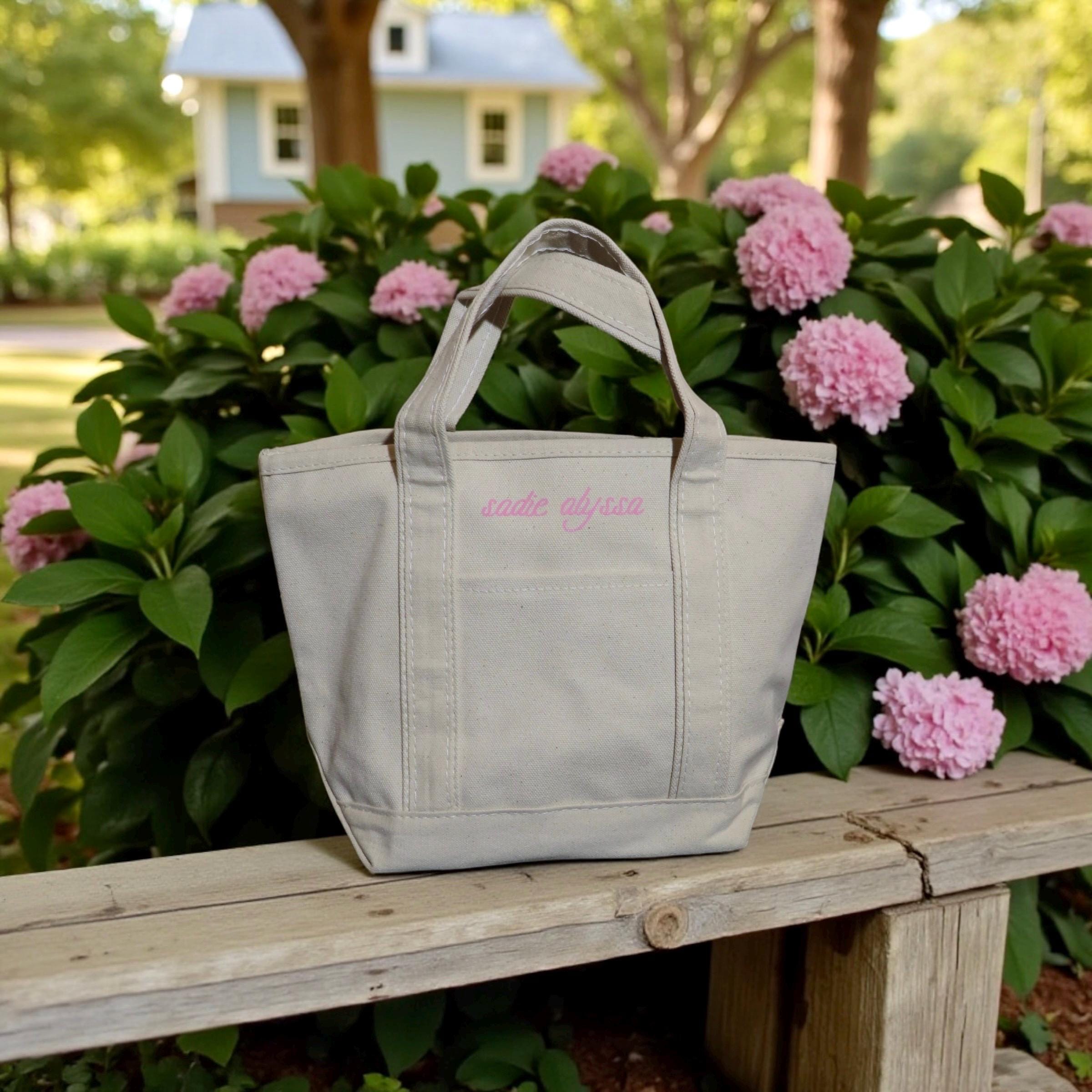 ✨ Details • 9.5" H X 13.5" W X 5.5" D • 1.40 lbs • 18 oz Canvas • Open top with front exterior pocket. • Contrasting color handles with a 5" drop. • Reinforced bottom for extra structure • Personalized with name, monogram, or title • Option to add icons – hearts, bows, flowers, stars, dog icons & more