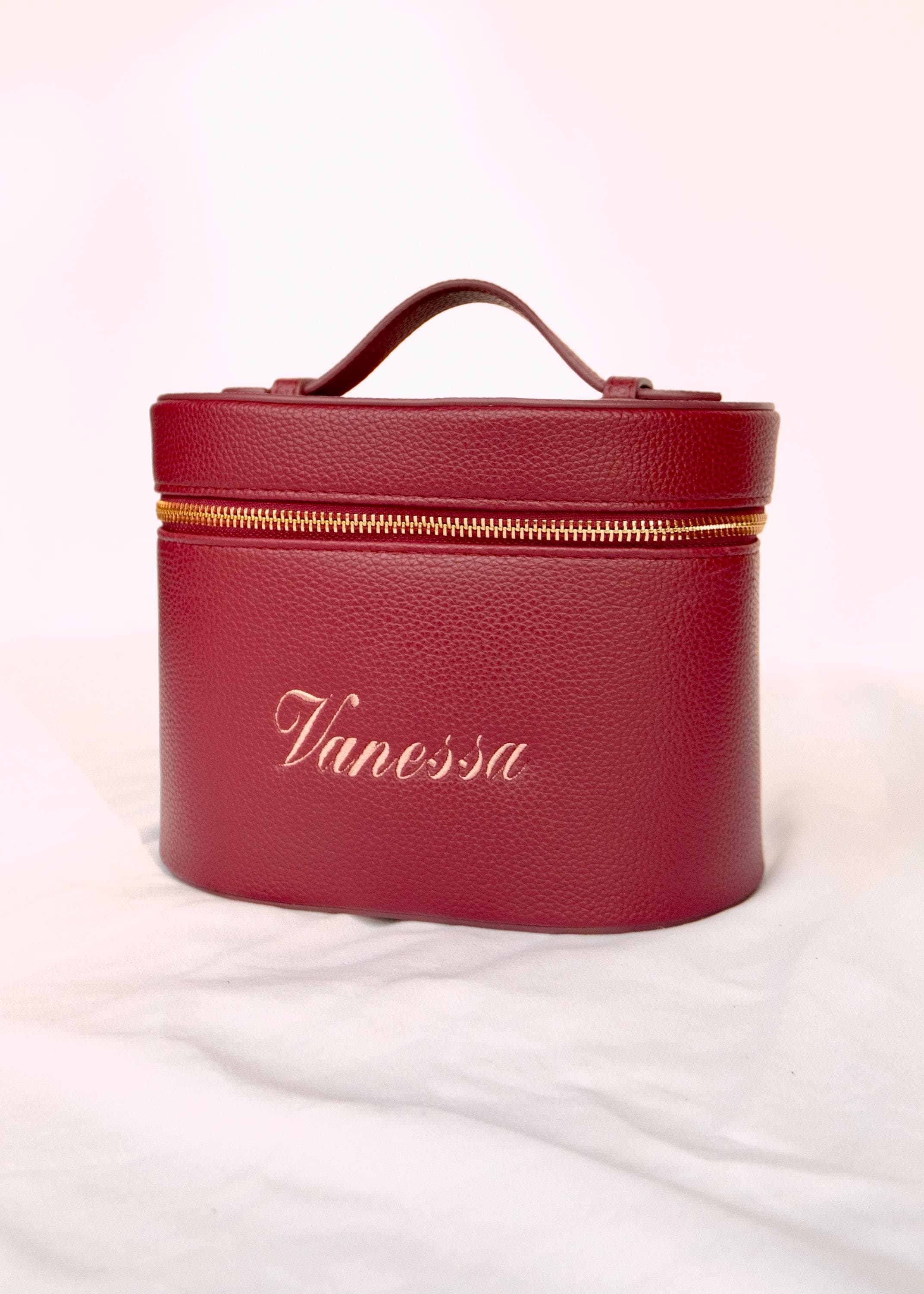 A structured vanity case custom embroidered with your name. Designed to keep makeup, skincare, and beauty essentials beautifully organized — and perfect for gifting.
